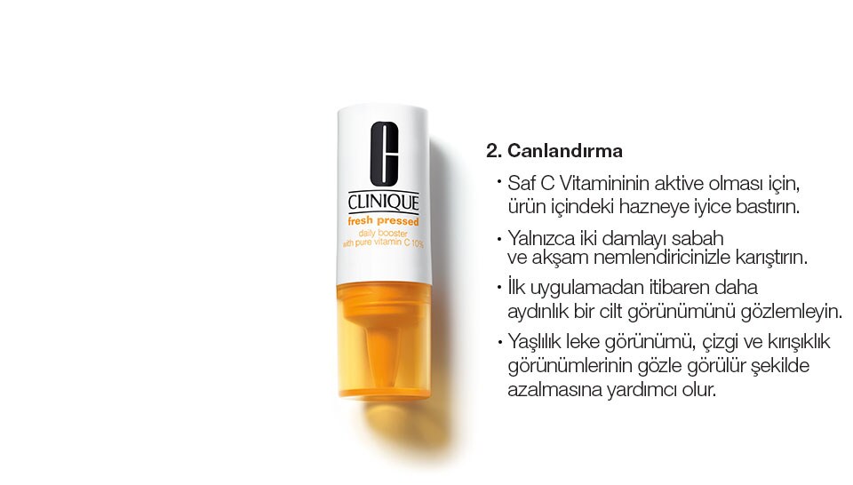 2 damla Clinique Fresh Pressed Saf %10 C Vitaminli Günlük Canlandırıcı Takviyeyi nemlendiricinize ekleyerek etkili sonuçların tadını çıkarın.